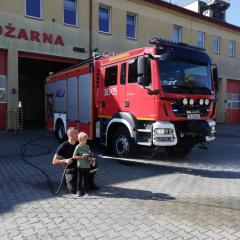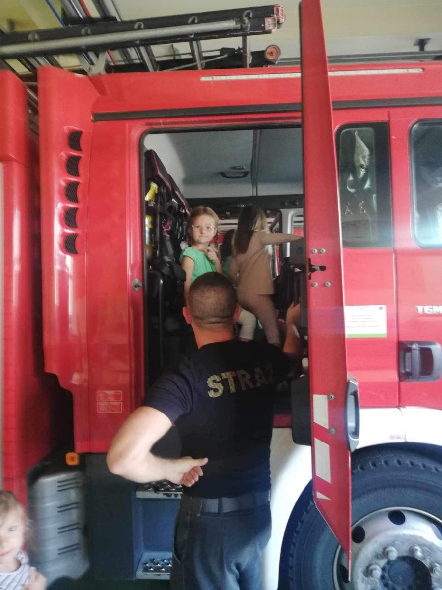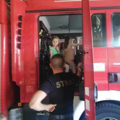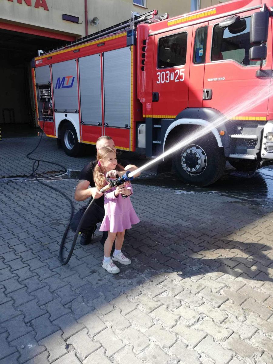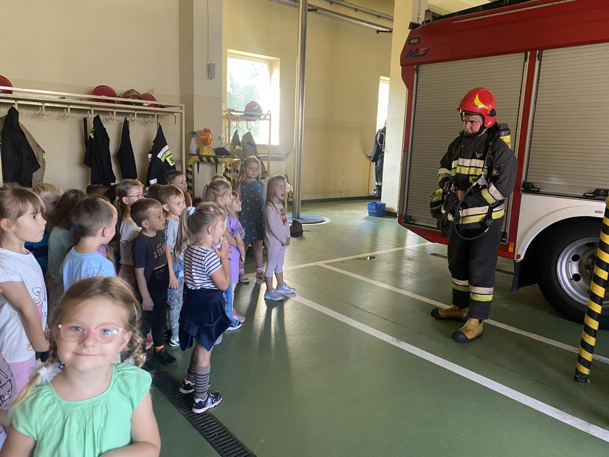 W piątek 29 września dzieci z grupy Średniaki 1 pieszo wybrały się na wycieczkę do Państwowej Straży Pożarnej w Kielcach. Realizują innowację pedagogiczną "W zdrowym ciele zdrowy duch", chciałyśmy zapoznać przedszkolaków z pracą strażaka oraz czynnościami wykonywanymi w ciągu dnia. Podopieczni mieli okazję wysłuchać jak należy dbać o zdrowie i ciało , aby móc wykonywać ten zawód. Wdrażana dzieci do aktywnego trybu życia. Przy okazji mieliśmy możliwość zwiedzenia całej remizy strażackiej. Dzieci wysłuchały również mądrej prelekcji odnośnie niebezpiecznych zabaw. Utrwaliliśmy numery alarmowe, a także sytuacje w których należy wzywać strażaków do pomocy. Zostały nam zaprezentowane wozy strażackie oraz niezbędny sprzęt pożarniczy. Był to dzień pełen wrażeń. Aby dodatkowo umilić ten czas każde, dziecko miało możliwość lania wody wężem strażackim.