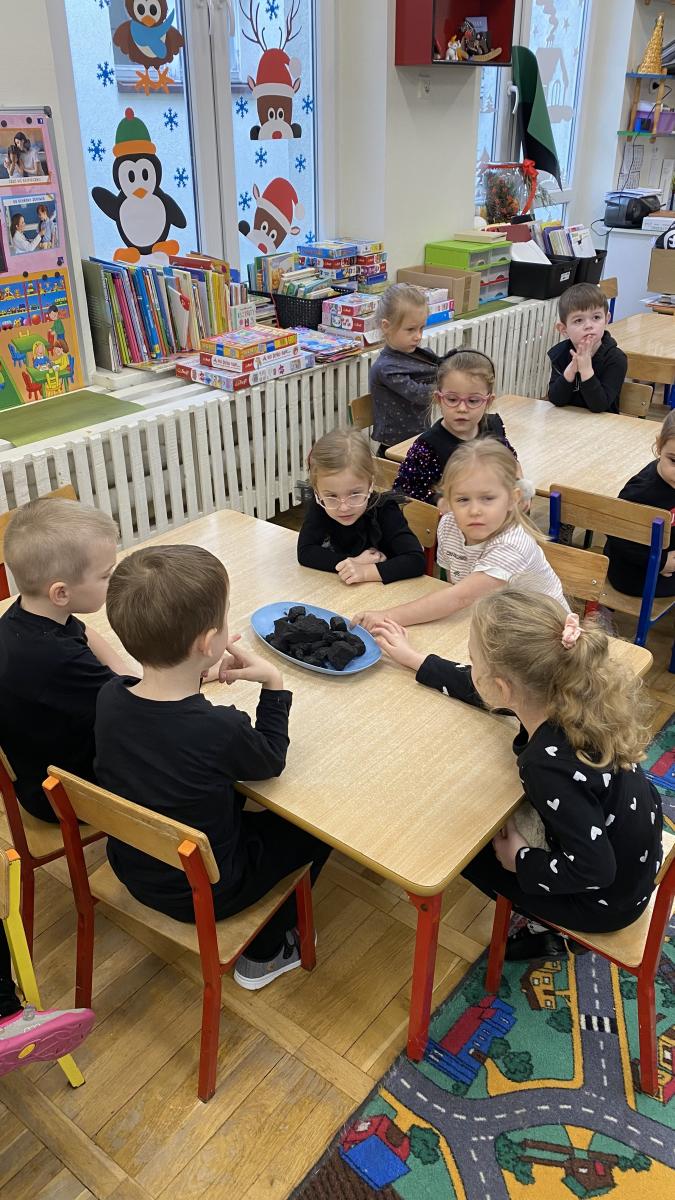 Nauczyciel przeprowadził zabawy badawcze z wykorzystaniem węgla, dzieci dowiedziały się do produkcji czego - jest on wykorzystywany.