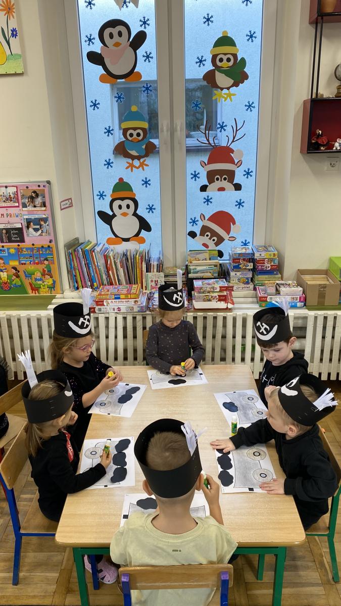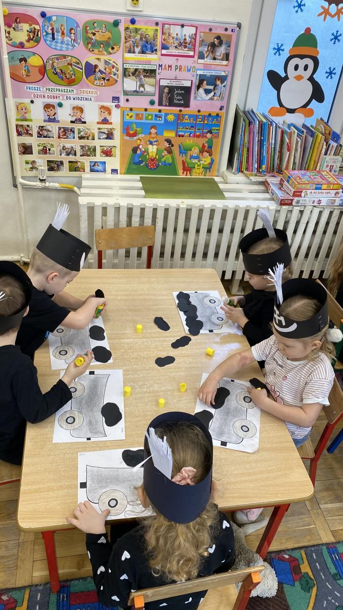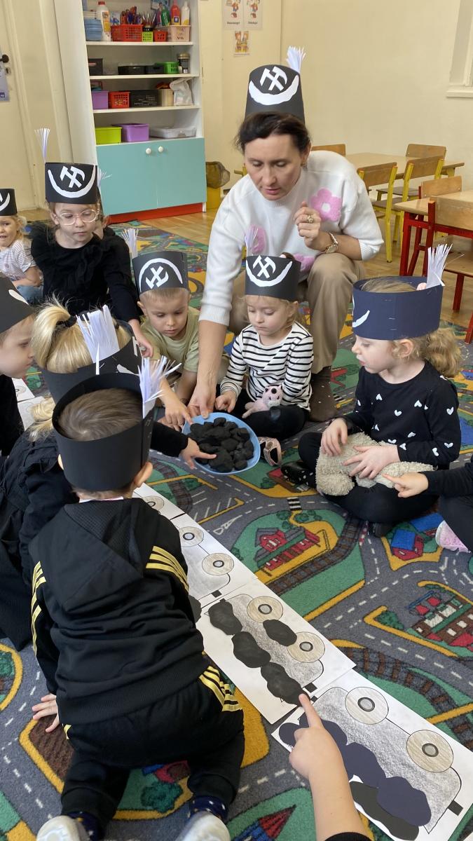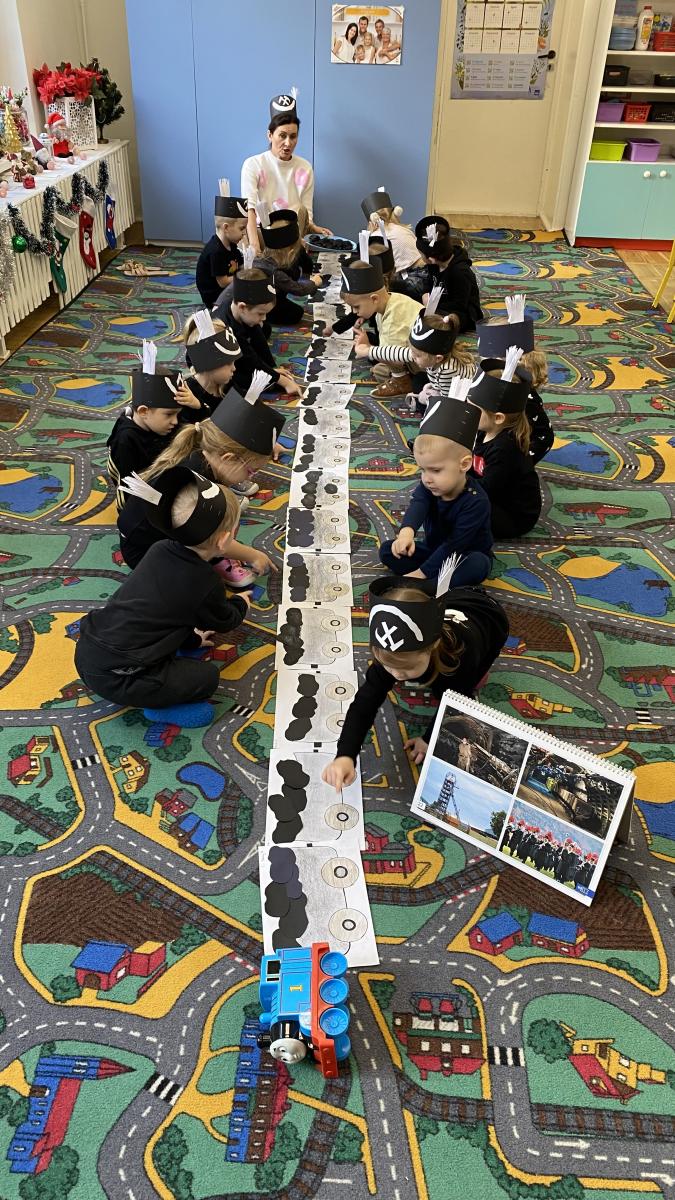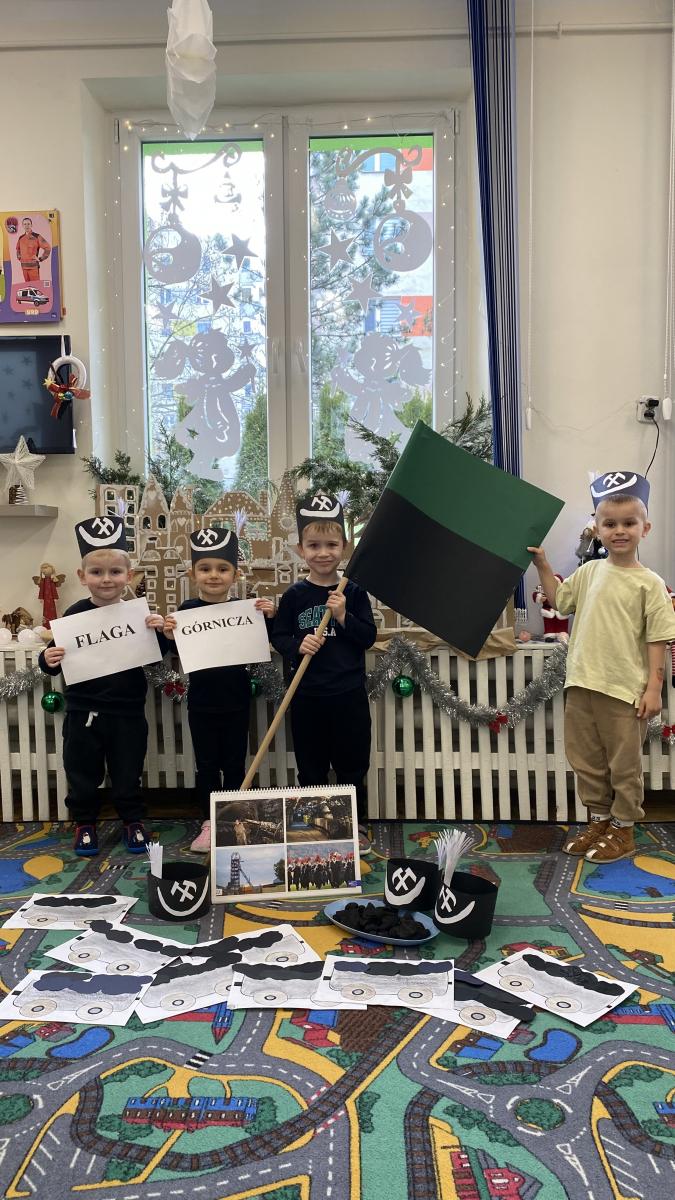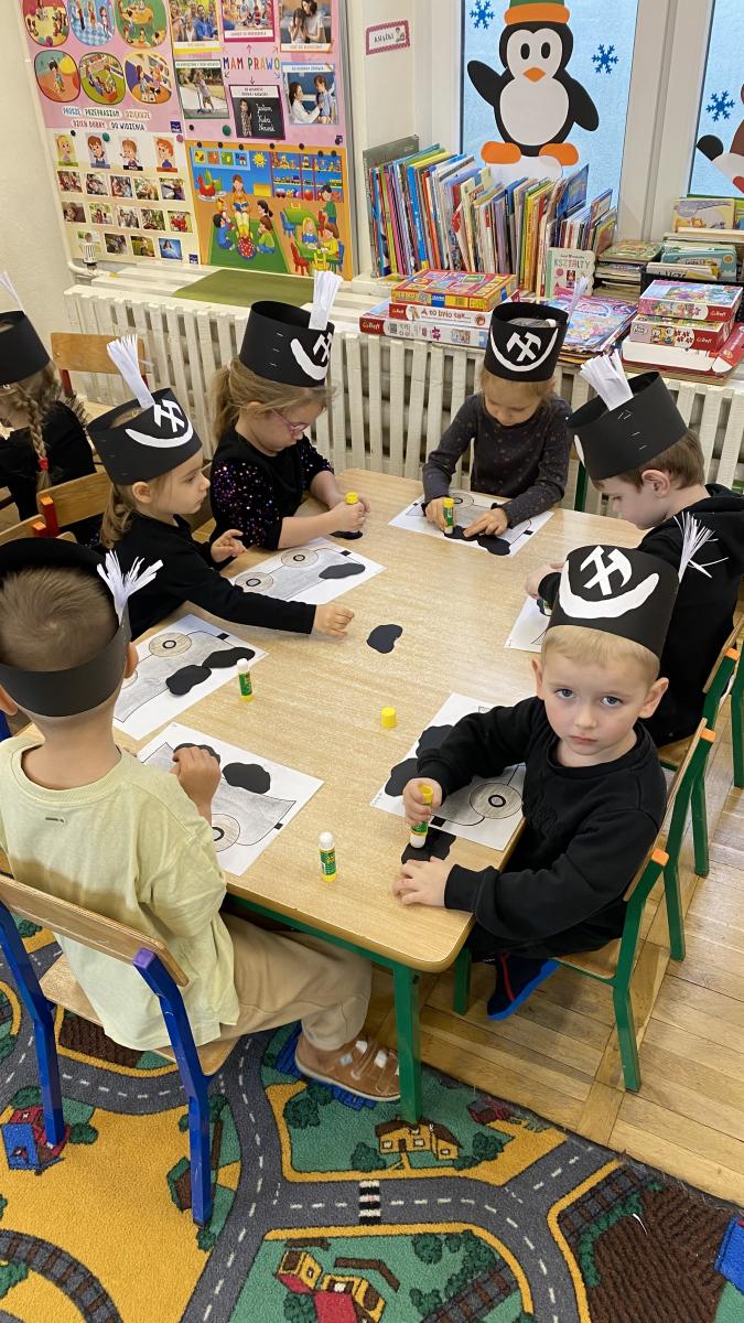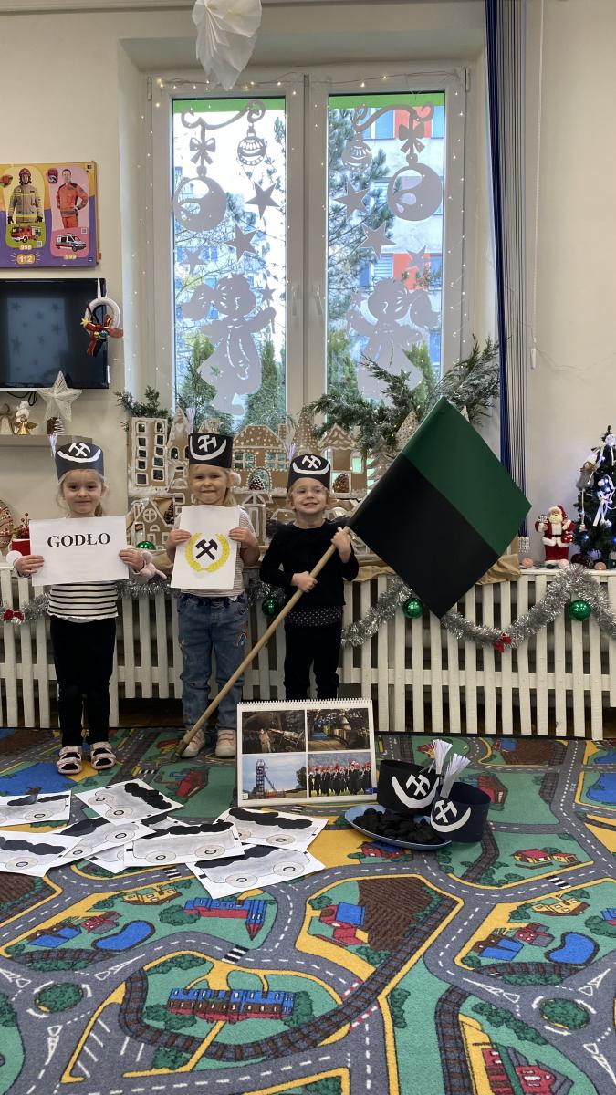 Przedszkolaki wykonały czapki górnicze, które ozdobiły ich głowy. Dowiedziały się jakiego koloru jest flaga górnicza, jak brzmi hymn oraz jak wygląda godło górników. Poznały narzędzia niezbędne do pracy w kopalni.