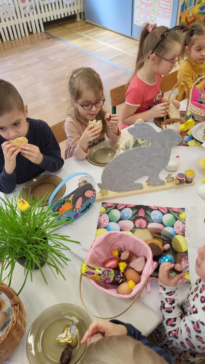Kolejny już rok w grupach Średniaki 4 i Średniaki 5 odbyło się wyjątkowe śniadanie. Przez ostatnie dni dzieci poznawały różne tradycje związane ze Świętami Wielkiej Nocy. Zwieńczeniem licznych opowieści o zwyczajach Wielkanocnych było wspólne świąteczne śniadanie. Dzieci zaprezentowały poznane piosenki o świętach, a następnie Pani Dyrektor złożyła świąteczne życzenia wszystkim przedszkolakom i pracownikom przedszkola. Potem wszyscy zasiedli przy świątecznym stole i z apetytem zjedli przygotowane potrawy znajdujące się w pięknie przygotowanych koszyczkach. Ten wyjątkowy dzień zapewne na długo pozostanie w pamięci dzieci.