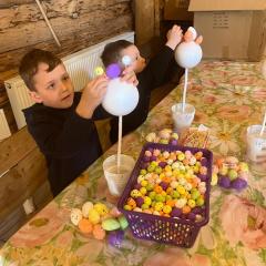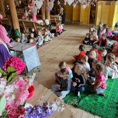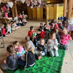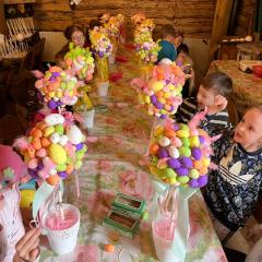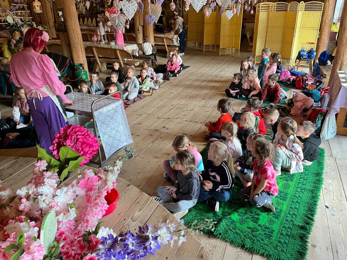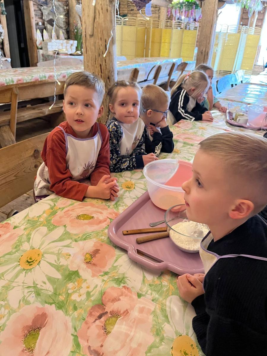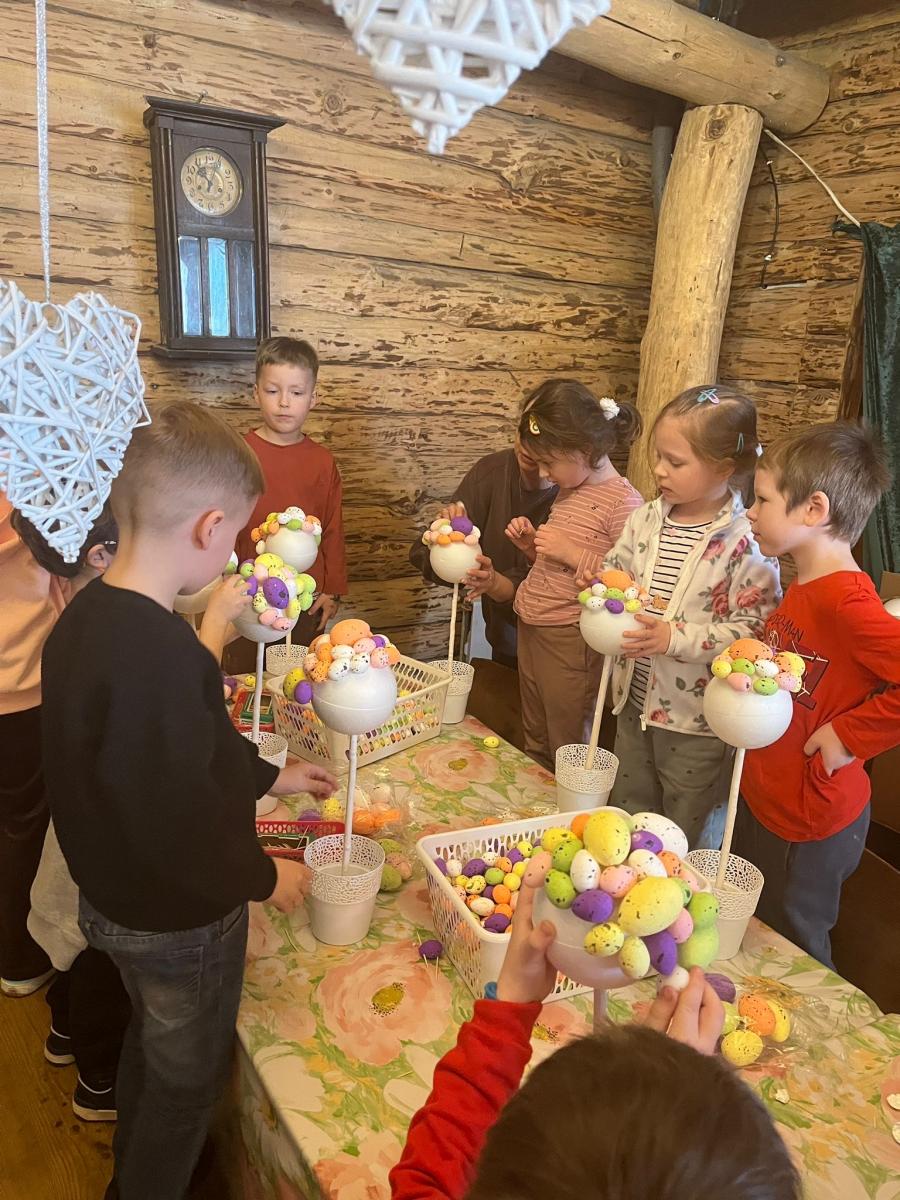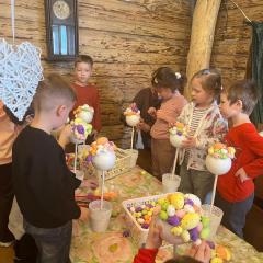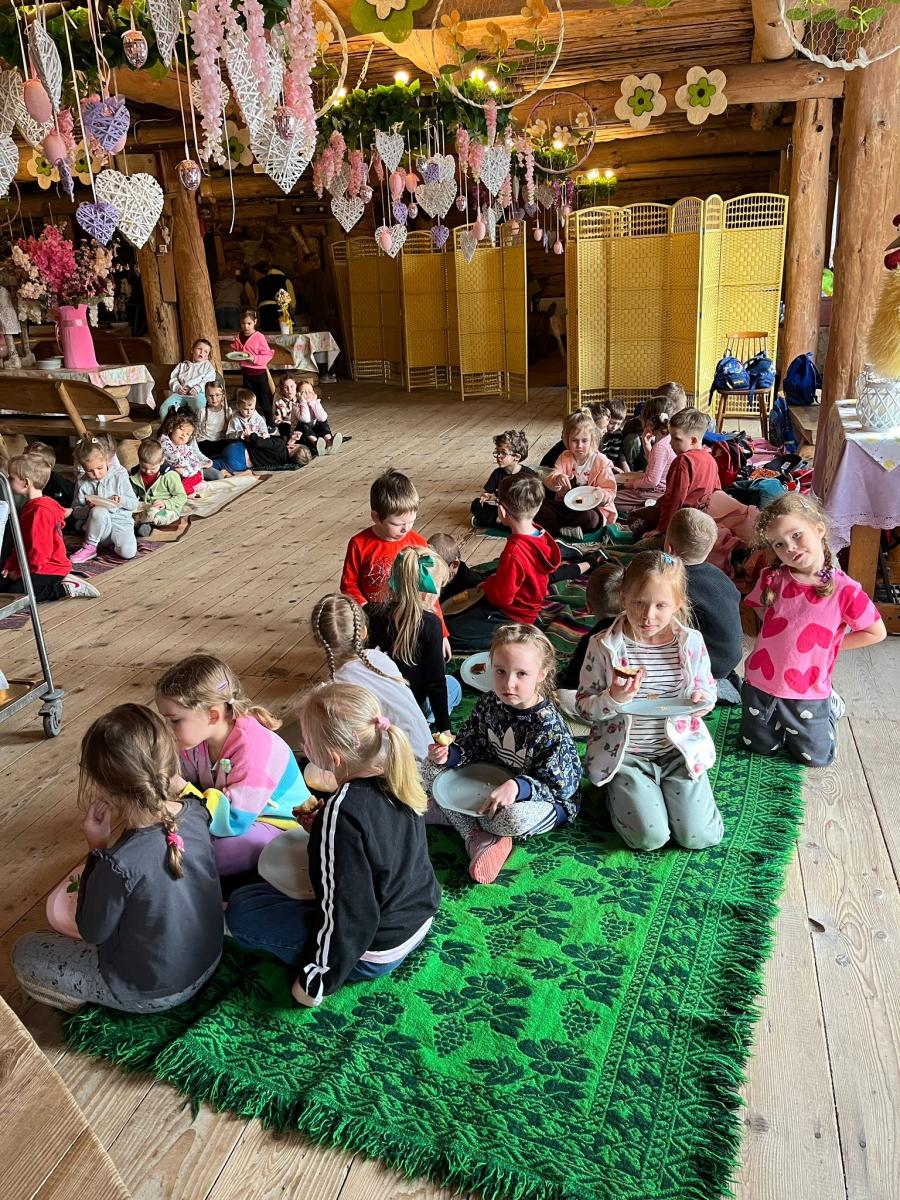 Po przyjeździe dzieci wysłuchały ciekawej opowieści o tym, skąd wzięły się wielkanocne jajka i zajączki. Dowiedziały się, że jajko od dawna jest symbolem nowego życia i wiosny, a zajączek stał się symbolem świąt, ponieważ w dawnych czasach był zwiastunem nadchodzącej wiosny. Dzieci słuchały z ogromnym zainteresowaniem i chętnie odpowiadały na pytania.