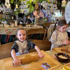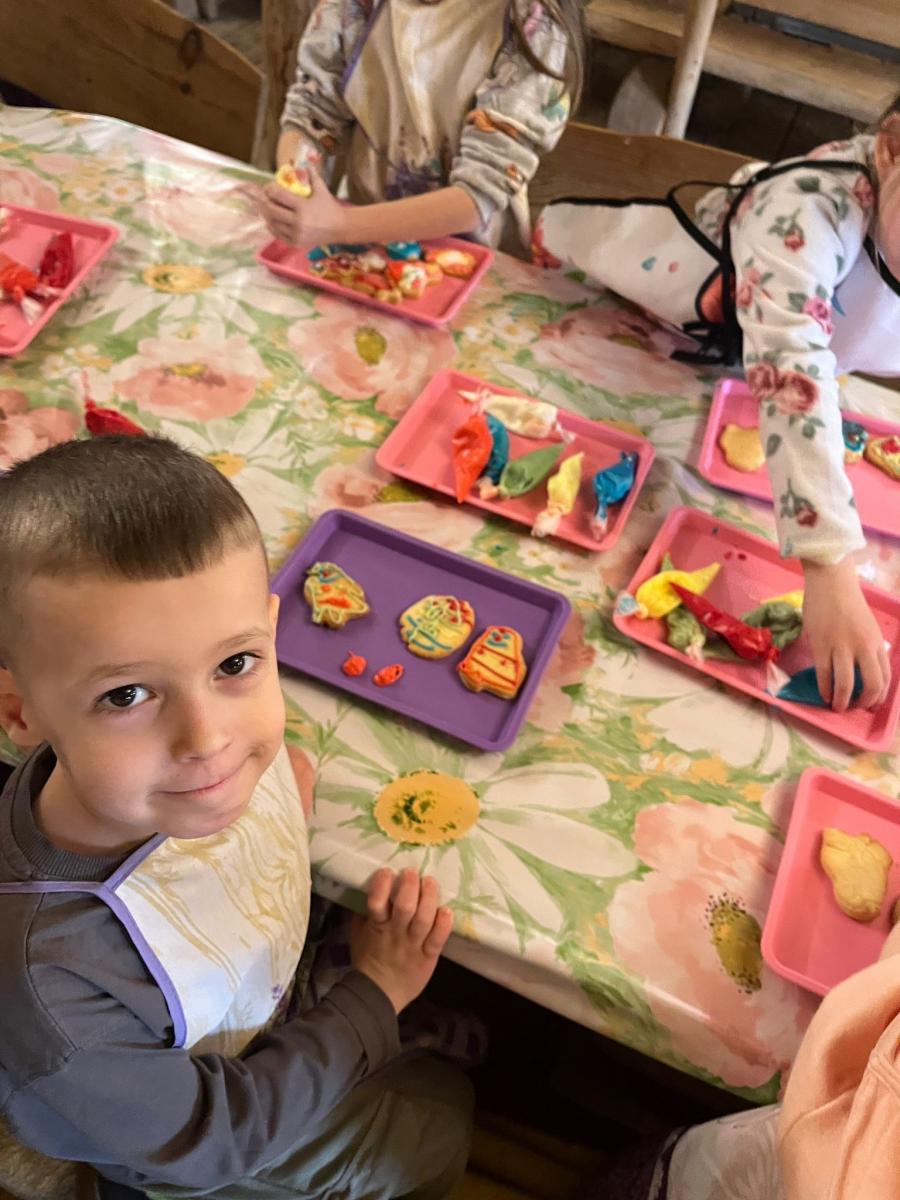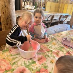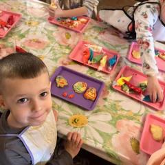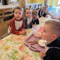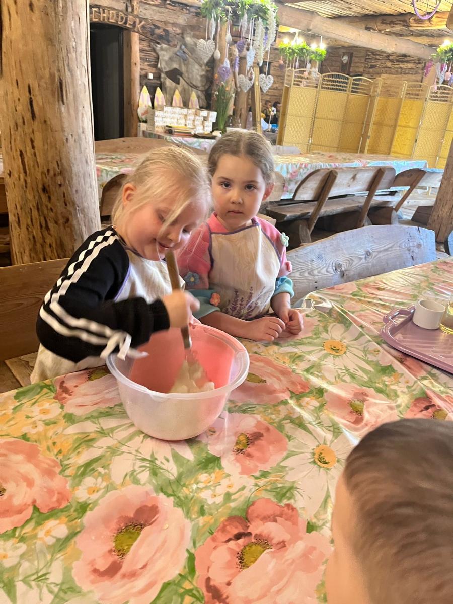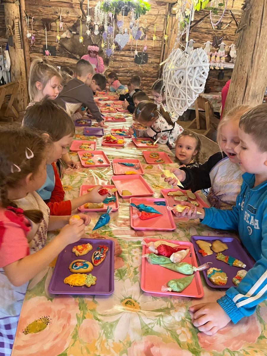 Kolejną atrakcją były warsztaty cukiernicze. Dzieci samodzielnie przygotowywały wielkanocne ciasteczka, które później dekorowały lukrem i kolorowymi posypkami. Powstały także pyszne babeczki wielkanocne, które wyglądały niemal jak małe dzieła sztuki. Przedszkolaki z ogromną starannością ozdabiały swoje wypieki, a przy tym świetnie się bawiły.