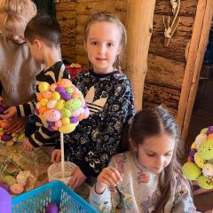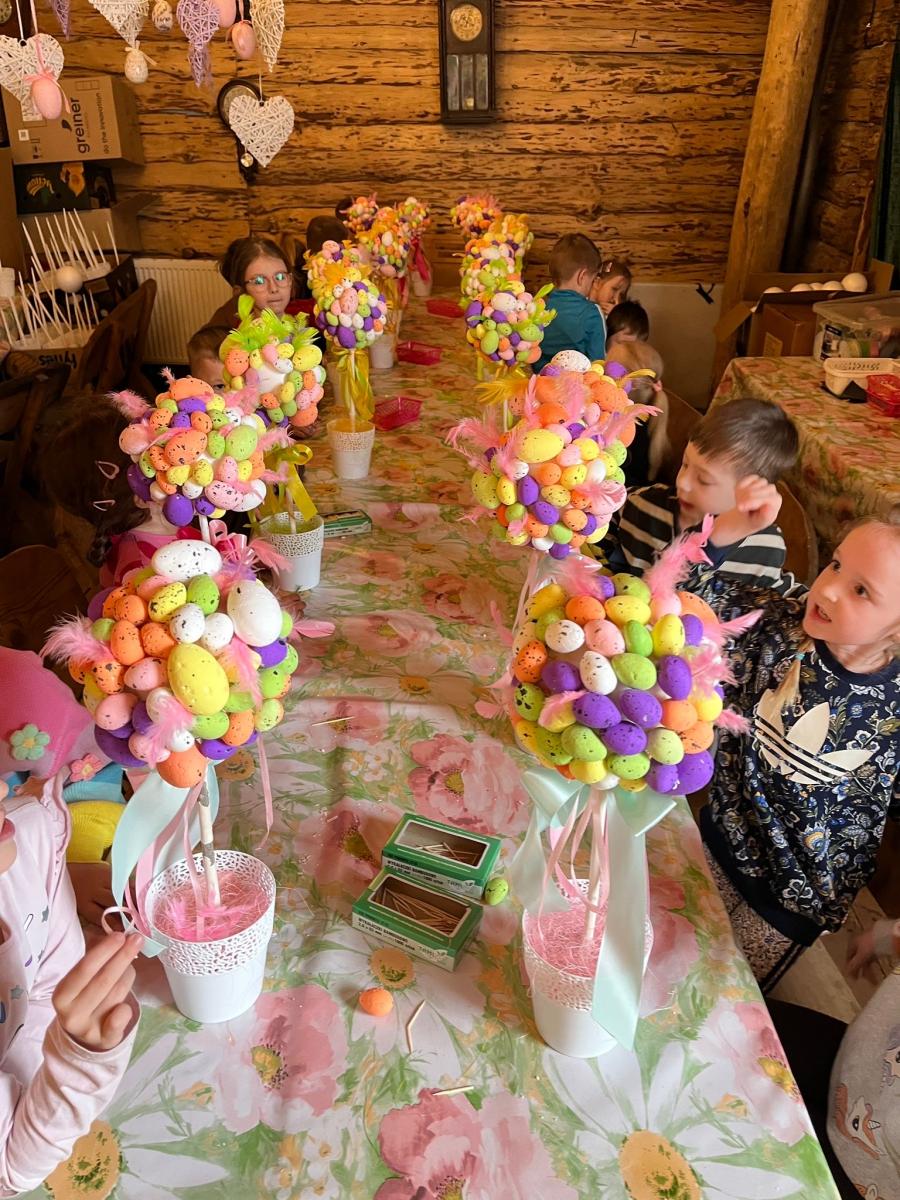 Następnie rozpoczęły się warsztaty plastyczne. Przedszkolaki wykonały własne drzewka wielkanocne, ozdabiając  gałązki kolorowymi jajeczkami,  piórkami, wstążkami i różnymi wiosennymi dekoracjami. Powstały piękne, barwne prace, z których dzieci były bardzo dumne.