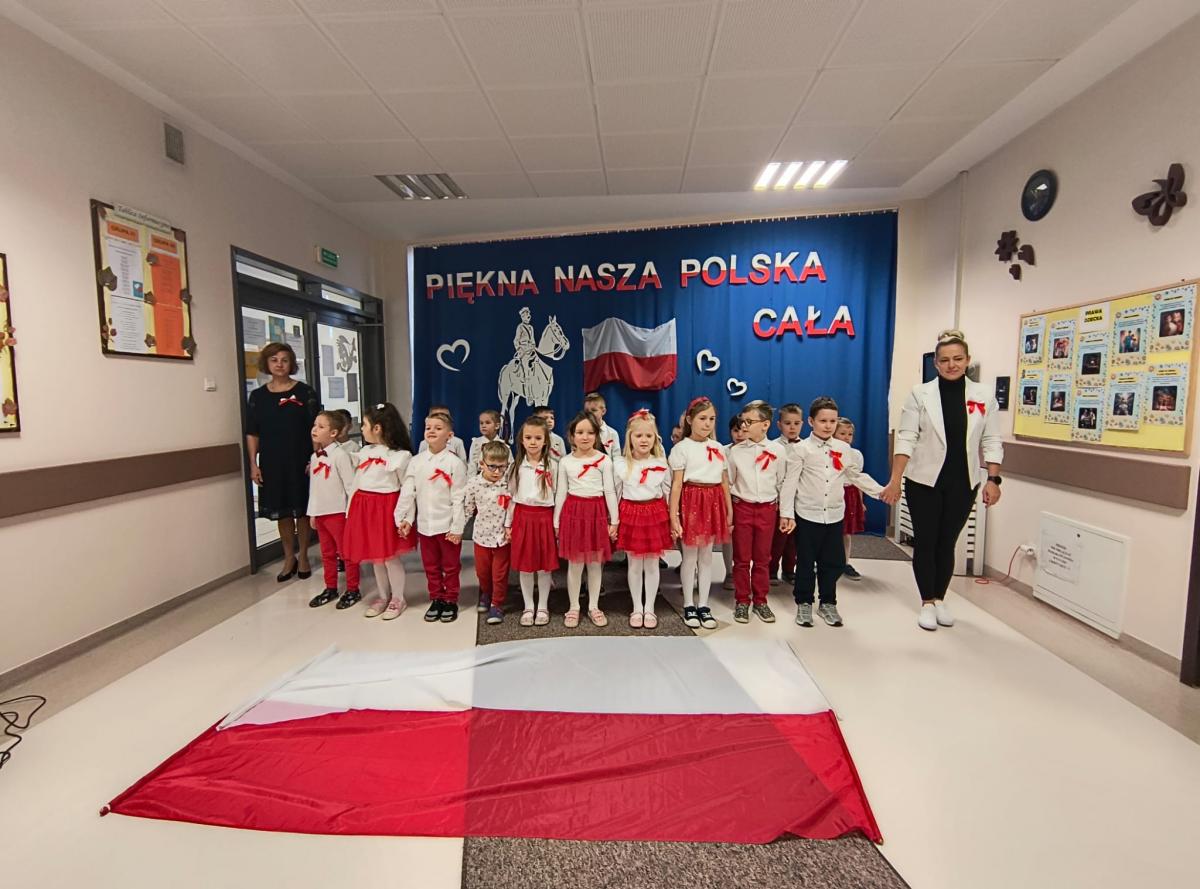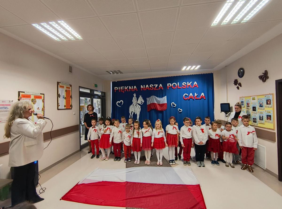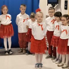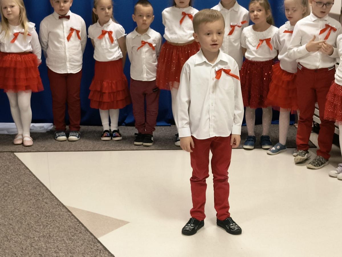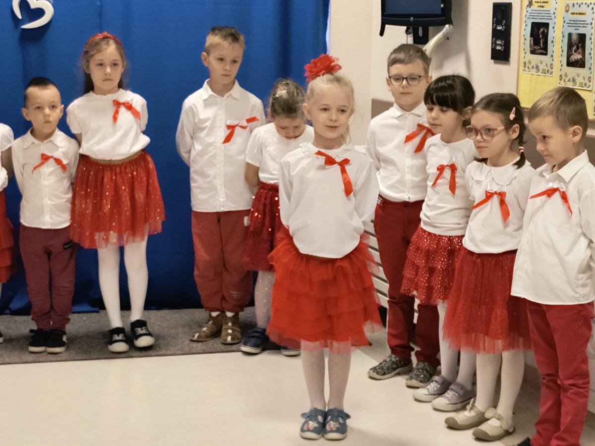 Dnia 12 listopada 2025 roku obchodziliśmy w naszym przedszkolu Święto Niepodległości. Z tej okazji dzieci z gr. Starszaki 1przyszły ubrane na galowo i uroczyście świętowali ten wyjątkowy dla Nas – Polaków dzień. Przedszkolaki wystąpiły przed Rodzicami z programem artystycznym. Podczas występu dzieci recytowały wiersze patriotyczne, śpiewały piosenki oraz zatańczyły taniec z biało – czerwonymi szarfami. Dumnie, przyjmując właściwą postawę „na baczność”, odśpiewano hymn Polski „Mazurek Dąbrowskiego”. Dzień Niepodległości stał się bardzo radosnym dniem w naszym przedszkolu i mamy nadzieję, że zapadnie on w pamięci naszych „Małych Polaków”. Dzięki udziałowi w tego typu uroczystościach, przedszkolaki od najmłodszych lat uczą się patriotyzmu, kształtują pozytywne postawy i uczucia patriotyczne.