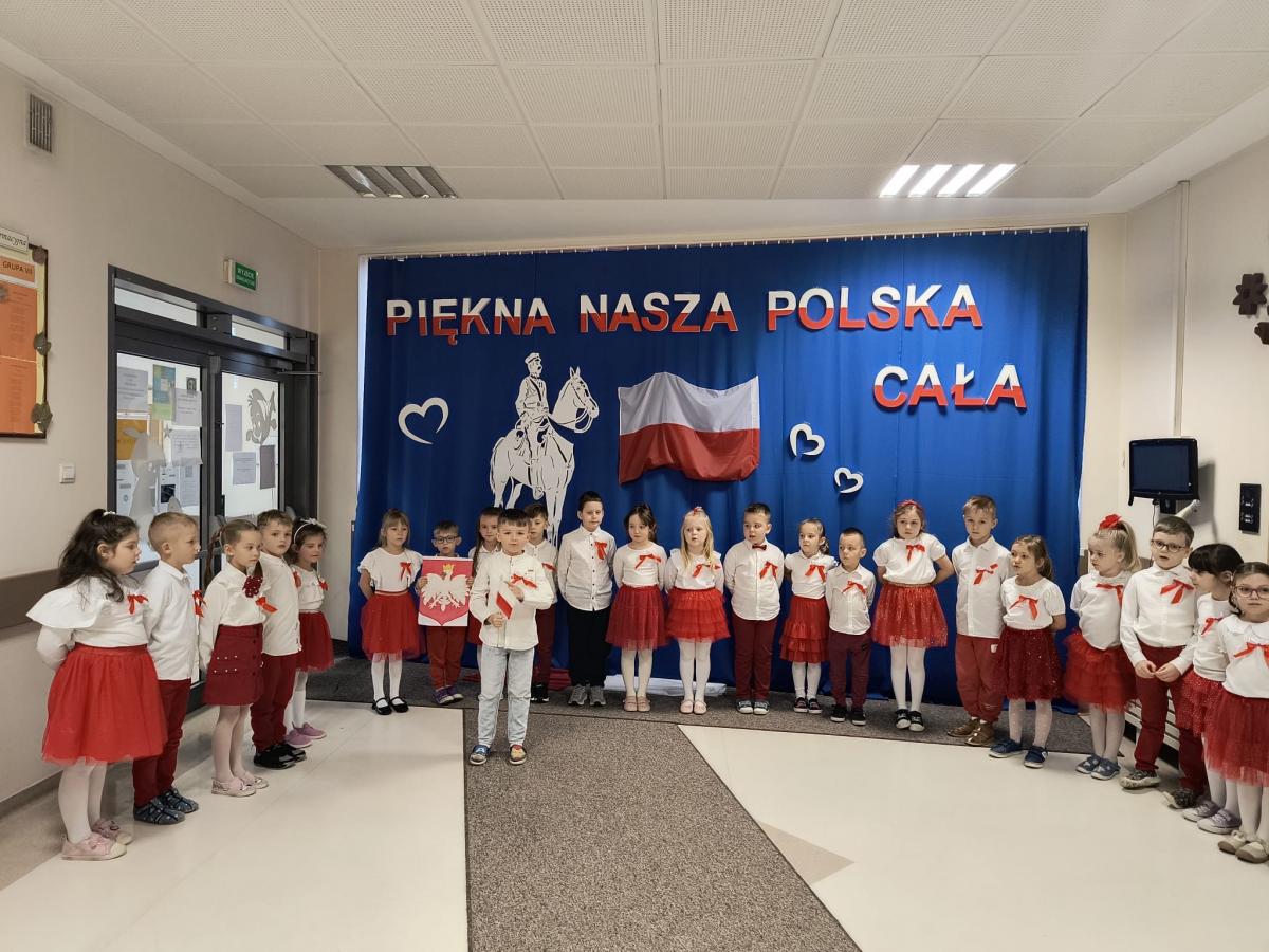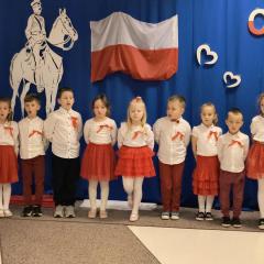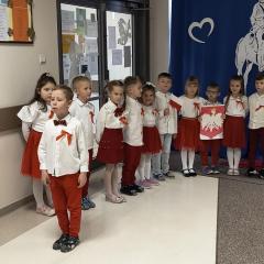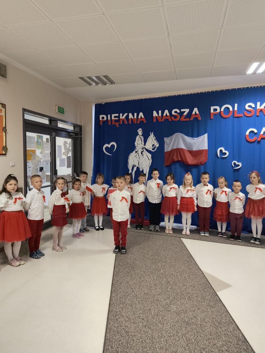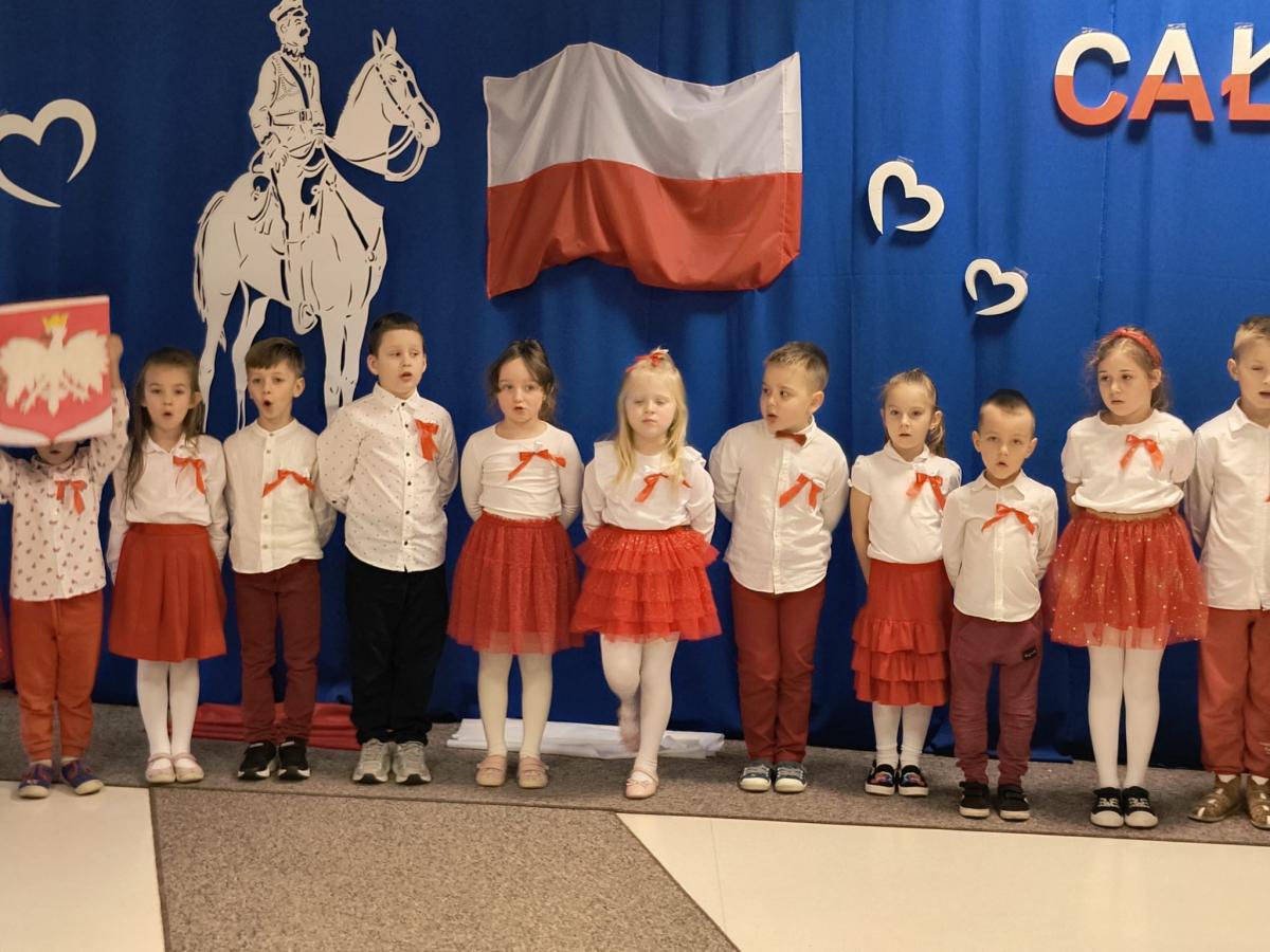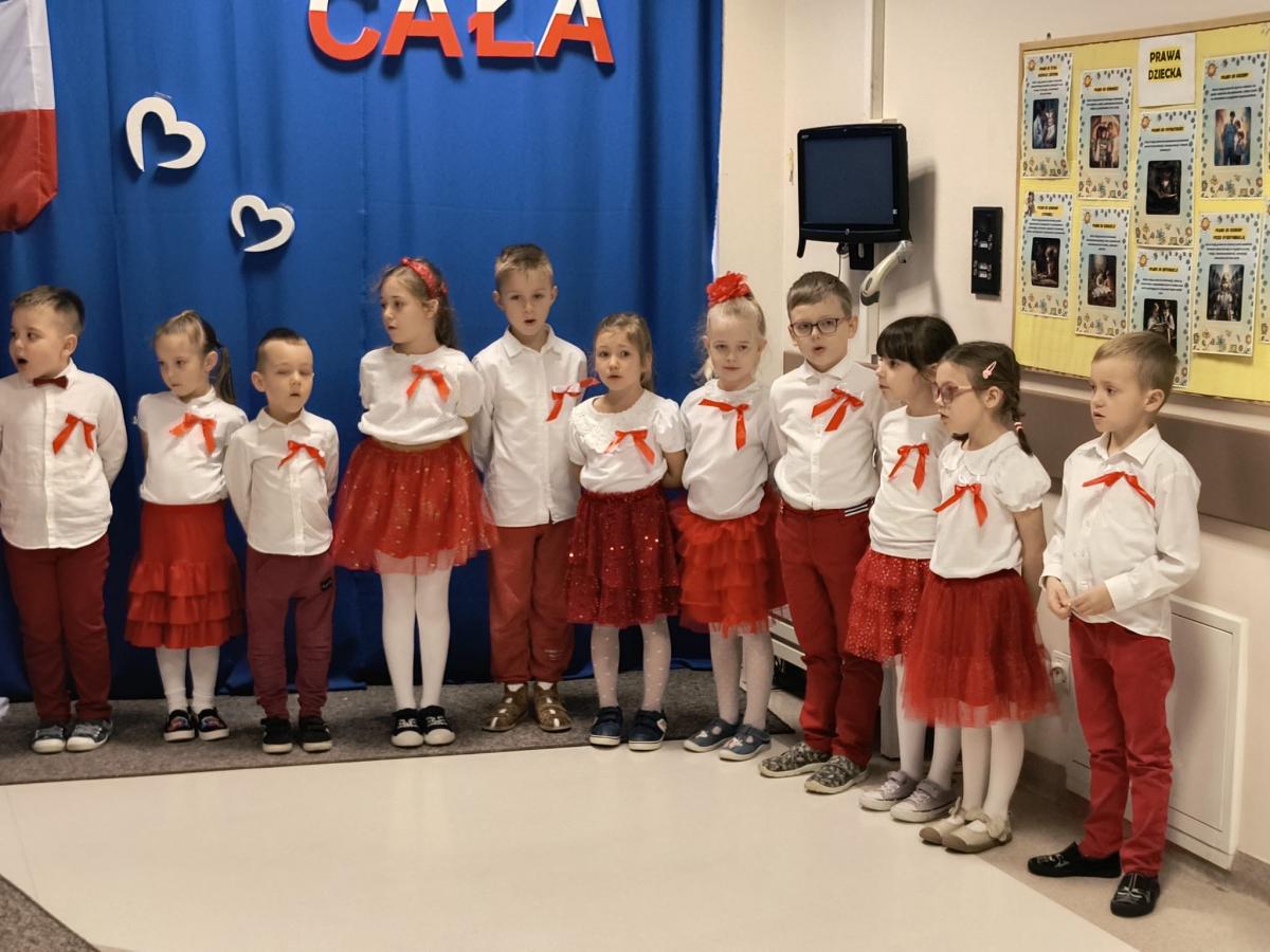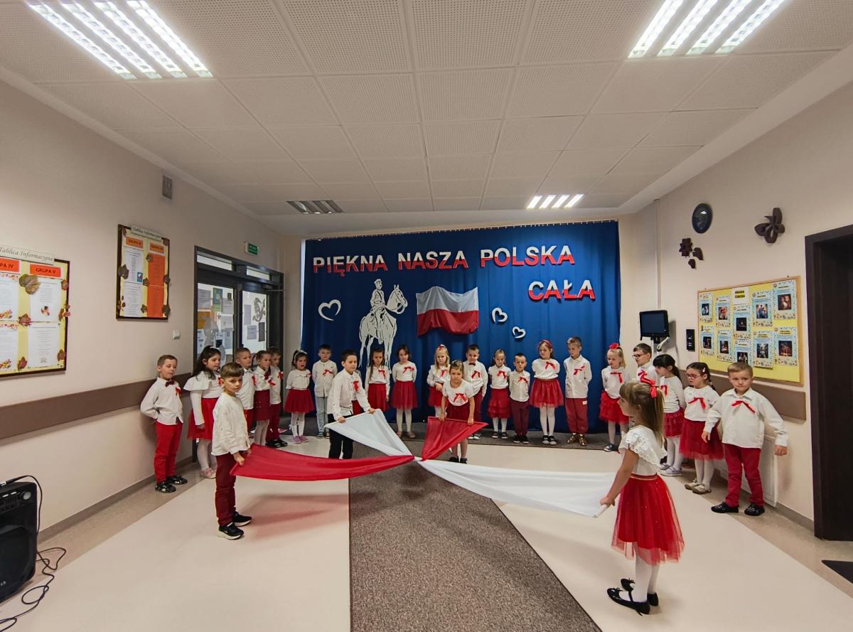 Dnia 12 listopada 2025 roku obchodziliśmy w naszym przedszkolu Święto Niepodległości. Z tej okazji dzieci z gr. Starszaki 1przyszły ubrane na galowo i uroczyście świętowali ten wyjątkowy dla Nas – Polaków dzień. Przedszkolaki wystąpiły przed Rodzicami z programem artystycznym. Podczas występu dzieci recytowały wiersze patriotyczne, śpiewały piosenki oraz zatańczyły taniec z biało – czerwonymi szarfami. Dumnie, przyjmując właściwą postawę „na baczność”, odśpiewano hymn Polski „Mazurek Dąbrowskiego”. Dzień Niepodległości stał się bardzo radosnym dniem w naszym przedszkolu i mamy nadzieję, że zapadnie on w pamięci naszych „Małych Polaków”. Dzięki udziałowi w tego typu uroczystościach, przedszkolaki od najmłodszych lat uczą się patriotyzmu, kształtują pozytywne postawy i uczucia patriotyczne.