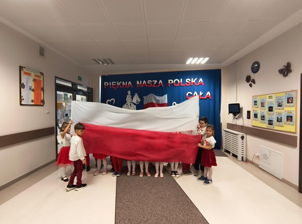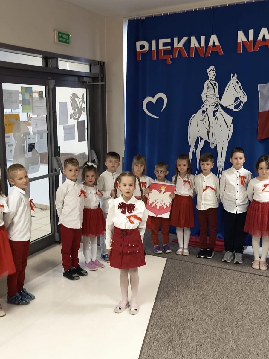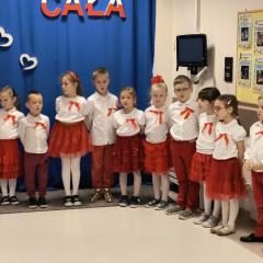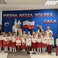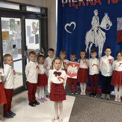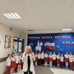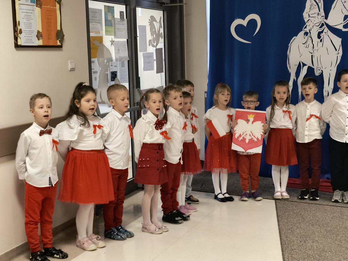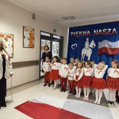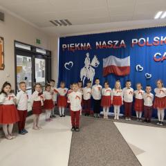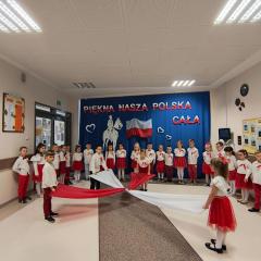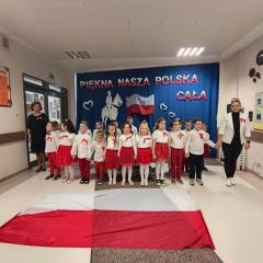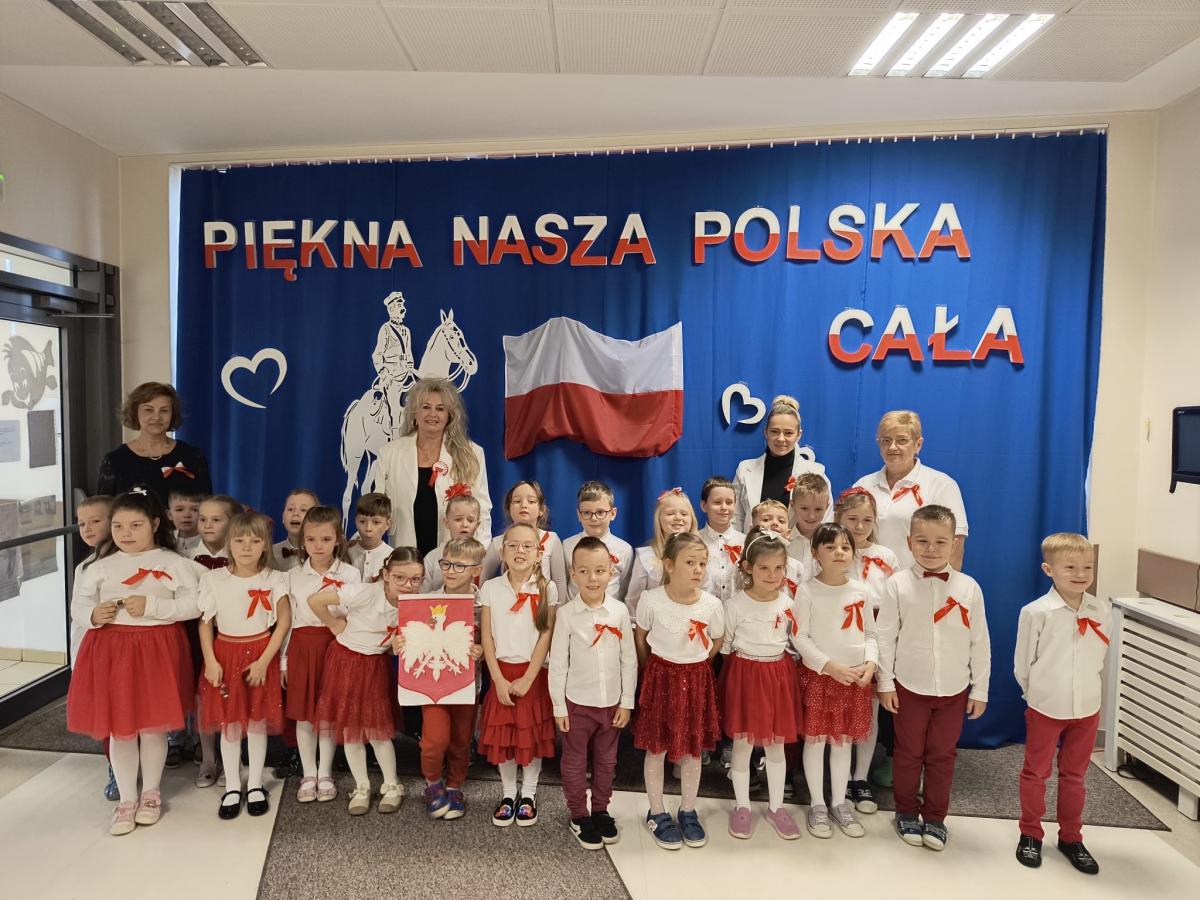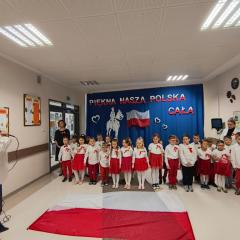 Dnia 12 listopada 2025 roku obchodziliśmy w naszym przedszkolu Święto Niepodległości. Z tej okazji dzieci z gr. Starszaki 1przyszły ubrane na galowo i uroczyście świętowali ten wyjątkowy dla Nas – Polaków dzień. Przedszkolaki wystąpiły przed Rodzicami z programem artystycznym. Podczas występu dzieci recytowały wiersze patriotyczne, śpiewały piosenki oraz zatańczyły taniec z biało – czerwonymi szarfami. Dumnie, przyjmując właściwą postawę „na baczność”, odśpiewano hymn Polski „Mazurek Dąbrowskiego”. Dzień Niepodległości stał się bardzo radosnym dniem w naszym przedszkolu i mamy nadzieję, że zapadnie on w pamięci naszych „Małych Polaków”. Dzięki udziałowi w tego typu uroczystościach, przedszkolaki od najmłodszych lat uczą się patriotyzmu, kształtują pozytywne postawy i uczucia patriotyczne.