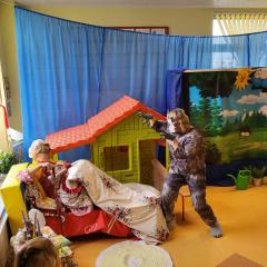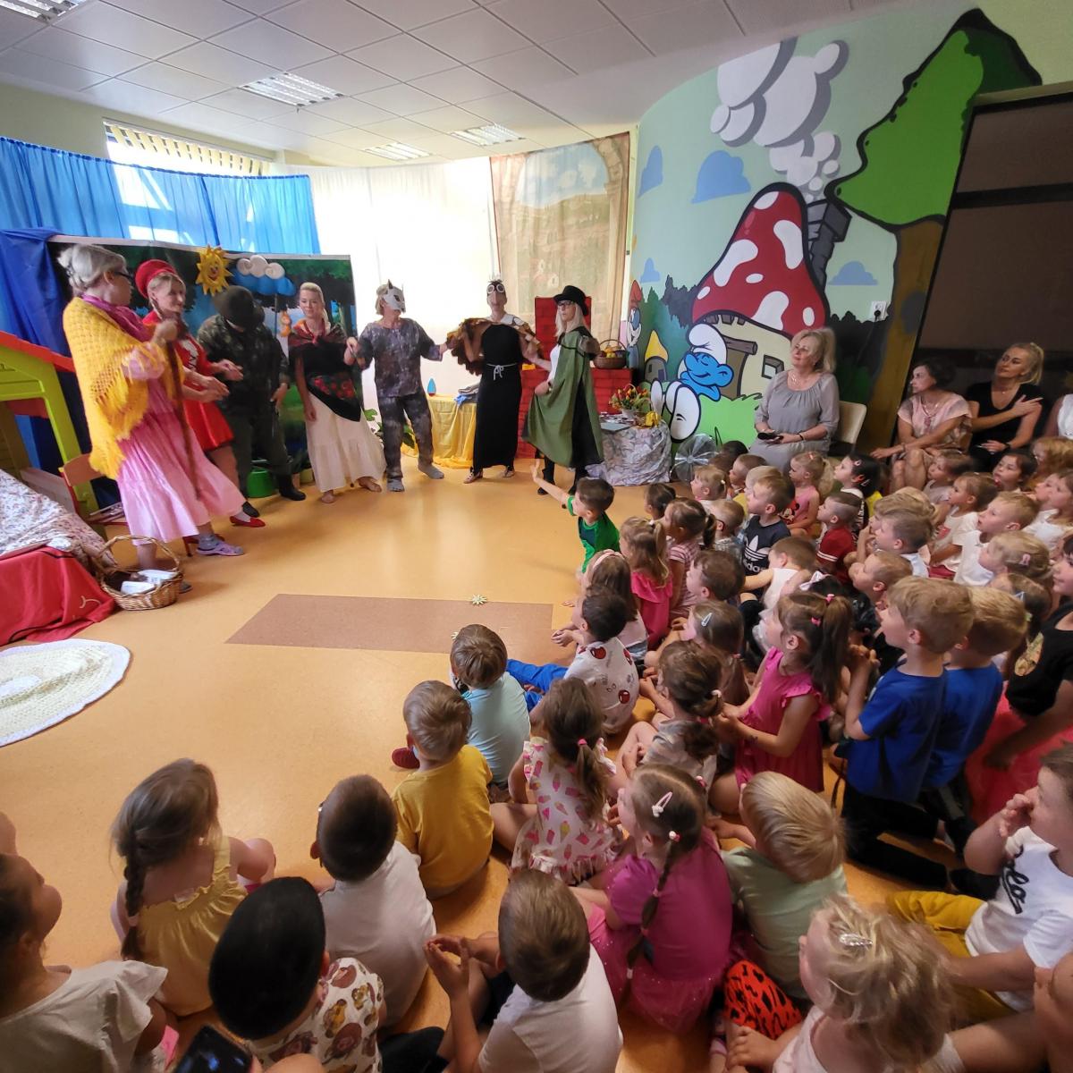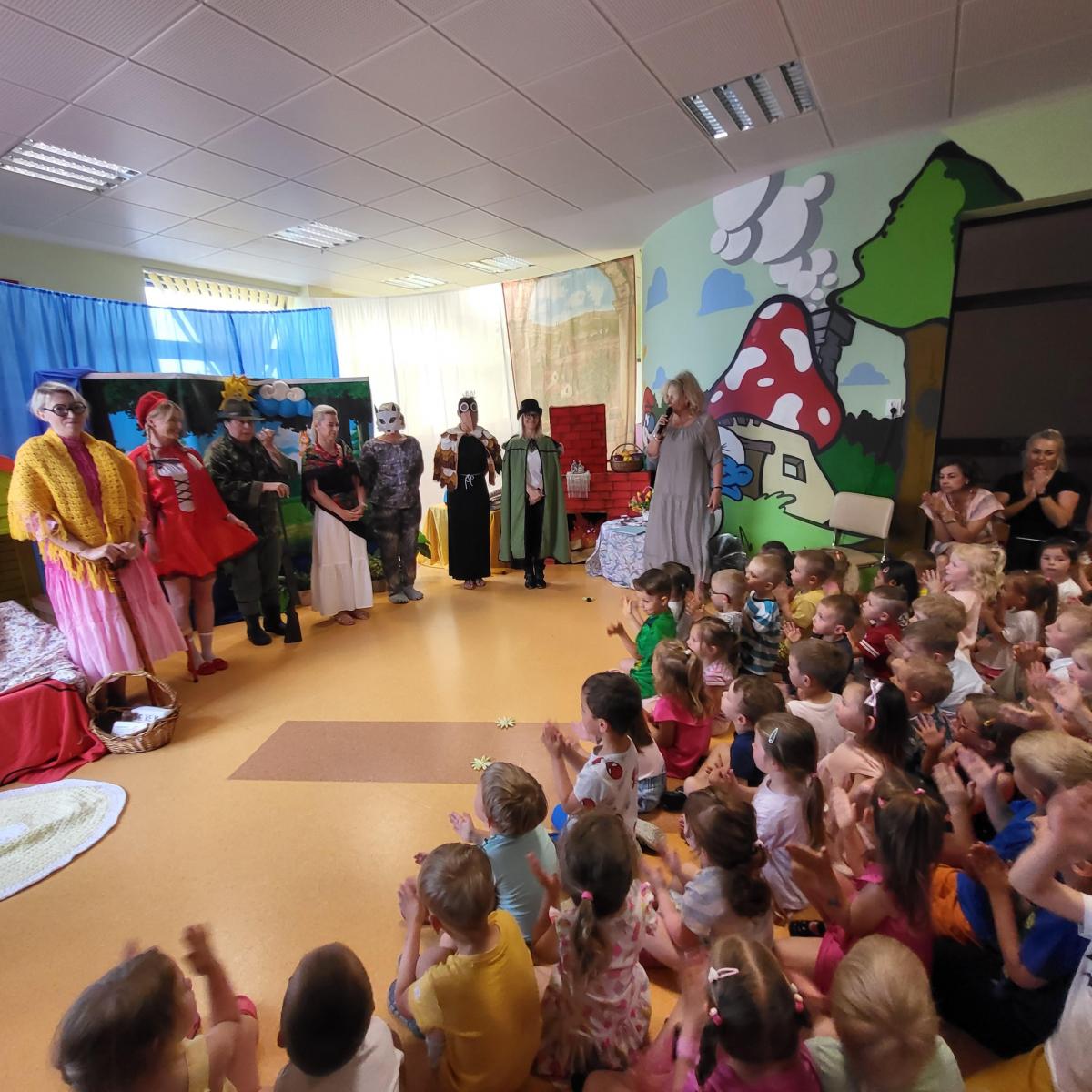 Odchodzące 5-cio latki pożegnały się z naszym przedszkolem w sposób wyjątkowy, bo to nauczyciele przygotowali dla dzieci niespodziankę - inscenizację bajki pt. "Czerwony Kapturek". Nauczyciele cudownie wcieli się w różne postacie z bajki, stworzyli pomysłowe stroje i scenografię, nie zabrakło również łez, ale tych ze śmiechu.