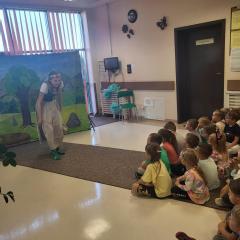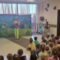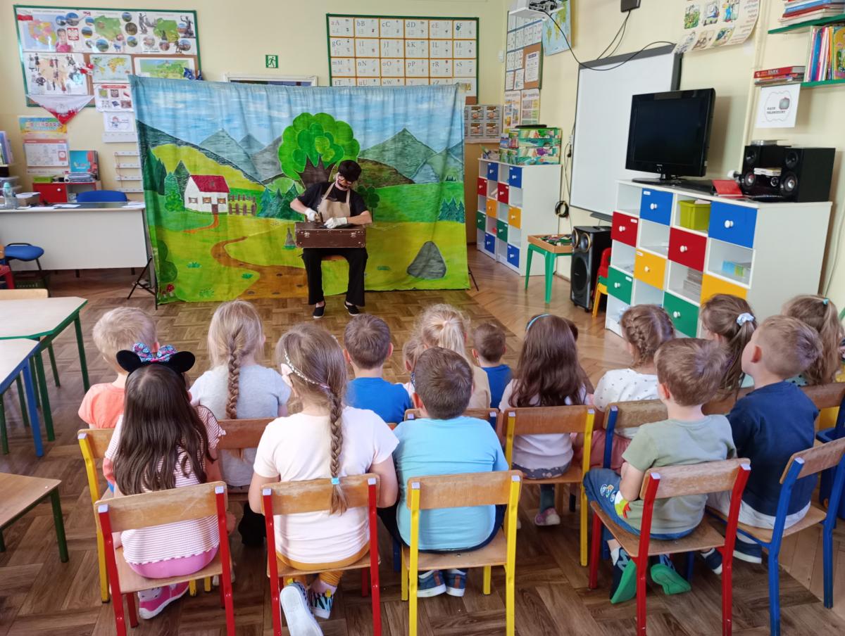 W środę, 27 września wszystkie przedszkolaki - w roli widzów miały przyjemność spotkać się z artystami Teatru SKRZAT podczas przedstawienia ,,Jak Marysia mała słonko złapać chciała". Dzieciaki z zaciekawieniem oglądały przygody Marysi, która w siedmiomilowych butach podążała na spotkanie ze słonkiem. Na swojej drodze spotkała lotnika, zbója oraz psotnego duszka. Jak to w bajkach bywa, historia dobrze się zakończyła, a Marysia spotkała się ze słonkiem.