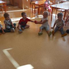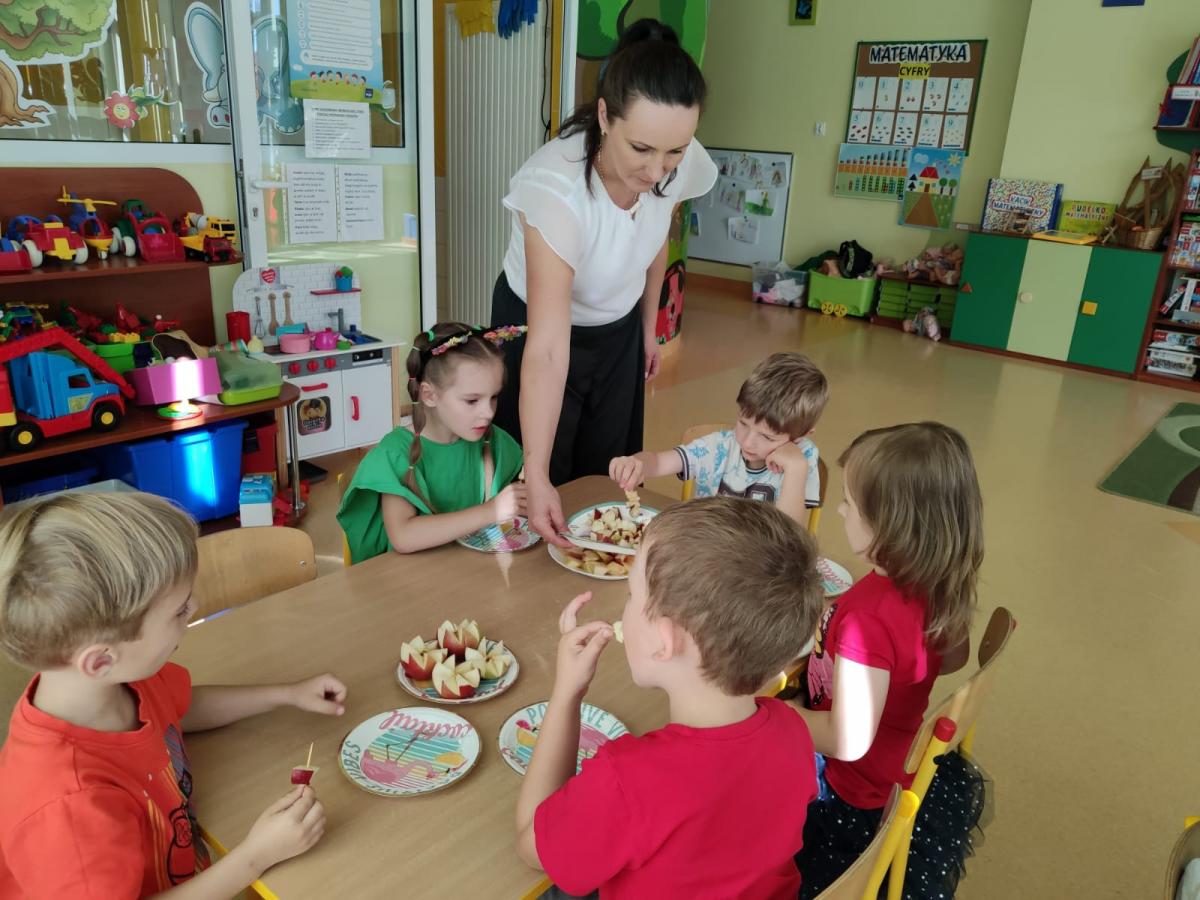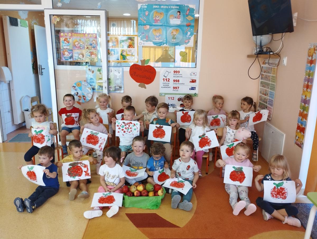 Obchody rozpoczęliśmy od rozmów na temat jego wyglądu, kolorów, wielkości, kształtu, smaku, różnych odmian, dlaczego warto je jeść, pod jaką postacią i czy tylko ludzie lubią te owoce? Przedszkolaki dowiedziały się ,że bardzo ważne jest to, żeby jeść owoc wraz ze skórką. Należy tylko pamiętać aby przed spożyciem dokładnie je umyć. Skąd się biorą jabłka dzieci dowiedziały się śledząc kolejne obrazki historyjki „Od pestki do jabłka”. Zapoznały się również z cyklem życia jabłoni. Wszystkie kolejne zabawy podczas pobytu dzieci w tym dniu w przedszkolu dotyczyły oczywiście jabłek. Były to zabawy ruchowe, dydaktyczne, naśladowcze i konkursy. Dzieci wykonały również jabłuszkowe kwiatuszki, które następnie zjadły ze smakiem. Po pysznym poczęstunku najmłodsi przystąpili do wykonania pracy plastycznej - kolorowych jabłek, które następnie przykleiły na dużym papierowym drzewie. Mamy nadzieję, że taki „tematyczny dzień” w przedszkolu zachęci dzieci do sięgania po owoce i posłuży do promocji zdrowego stylu życia.